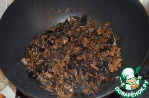 Свежие и отварные сушеные грибы отжать, нарезать на кусочки и обжарить на оливковом масле. Я жарю грибов сразу много, так как у нас дома грибы идут, наверное, почти во все блюда.
