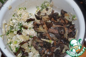 В творог добавить рис, мелко нарезанную зелень, грибы, вторую половину сыра. Посолить, поперчить и перемешать.