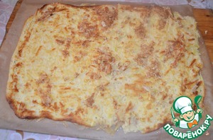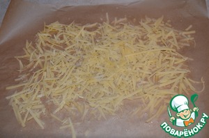 Отрезать второй лист пергаментной бумаги, смазать ее хорошенько оливковым маслом и посыпать оставшимся сыром (примерно 2 ст. л.)