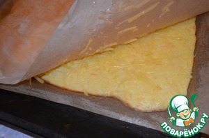 Достать наш омлет. Сверху его накрыть бумагой с сыром (сыром к омлету).