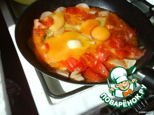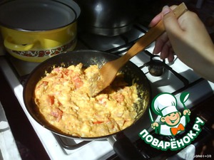 • Когда помидоры станут мягкими, добавляем яйца. Солим и перчим по вкусу.