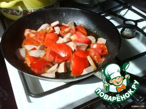• Режем мелко помидоры и сосиски. Кладем их на разогретую сковородку.