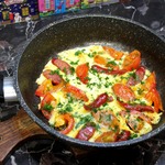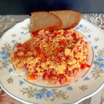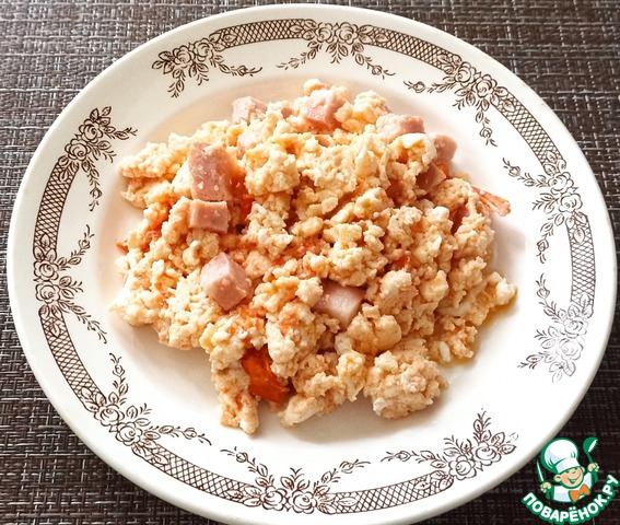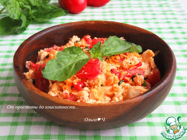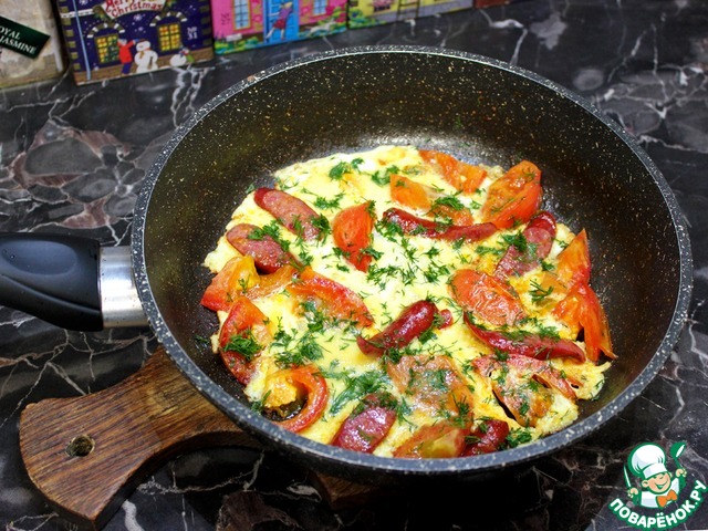 Когда помидоры станут мягкими, добавляем яйца. Солим и перчим по вкусу.