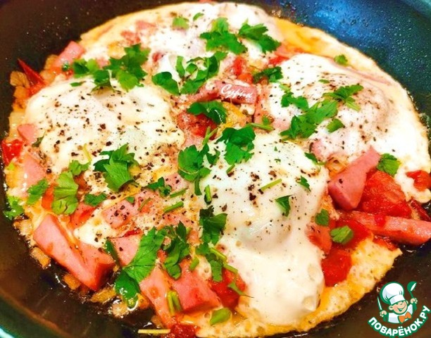 Очень вкусная и сытная яичница. У меня с куриной грудкой вместо сосиски. Спасибо за вкусный завтрак!