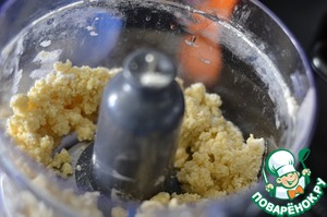 Готовим тесто: в комбайн поместить муку, сахар (50 г), молотый миндаль (15 г), щепотку соли. Нарезать кубиками холодное масло.