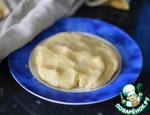 Превратить в однородную крошку. Влить 2 ст. л. холодной воды и перемешать до однородного теста, которое легко можно превратить в ком.