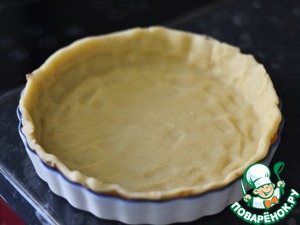 Подготовить форму для выпечки диаметром около 18-20 см. Перенести на нее бумагу с тестом. Подрезать лишнее тесто. Поместить снова в холодильник, пока готовим начинку. -