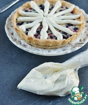 Подготовить кондитерский мешок или просто пакетик. Поместить взбитый крем. Срезать кончик и выложить крем на тарт в форме лепестков, начиная с центра.