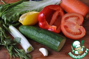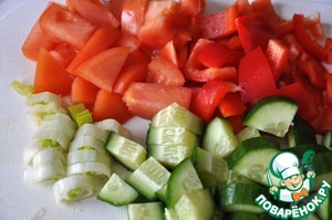 Помидор, болгарский перец и огурец нарезаем кубиками, лук-порей кольцами.