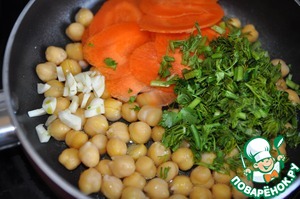 На сковороду наливаем оливковое масло и кладём нут. Прогреваем нут в масле 1 минуту.