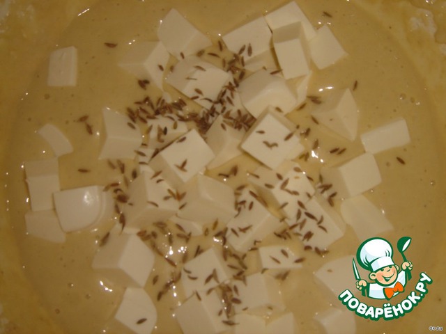 Аккуратно, чтобы не раздавить кусочки сыра, перемешайте тесто. -