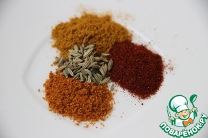 И в обязательном порядке нужно сразу подготовить специи. Берём 0,5 ч. ложки паприки, 0,5 ч. ложки фенхеля и 0,5 ч. ложки карри.