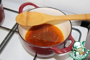 Ставим толстостенную кастрюлю на огонь и вливаем в неё масло. Когда масло разогрелось, добавляем специи и быстро перемешиваем в течение 30 секунд, вслед за этим добавляем мелко нарезанный чеснок, поджариваем его до золотистого цвета.