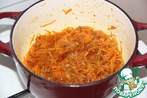 Теперь добавляем лук, немного обжарив, добавляем морковь и на медленном огне томим в течение 3-5 минут