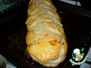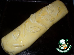 Скатать рулетом. Украсить вырезанными из обрезков теста листиками или как-нибудь еще. Смазать взбитым желтком.