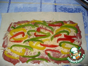 Фарш посыпать тертым сыром, потом сухарями, а сверху выложить полоски перца.