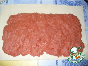Размороженное тесто раскатать прямоугольником. Края подравнять. Белок немного взбить и смазать им тесто. На тесто выложить фарш.