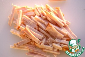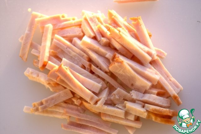 Пока блины охлаждаются, режем копченую грудку соломкой.