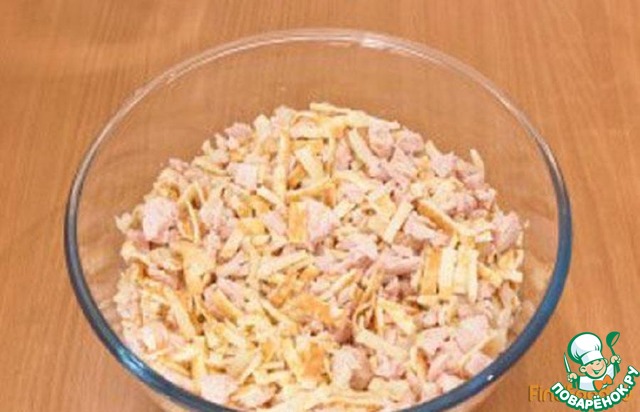 Когда блины остынут, их тоже нарезаем соломкой (примерно длиной 2 см, шириной 3 мм), можно еще тоньше)