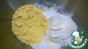 В большой миске смешайте муку, кукурузную муку, разрыхлитель и соль.