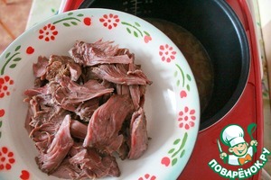 Утром бульон процеживаем, мясо разбираем руками на волокна.