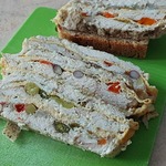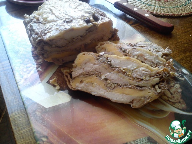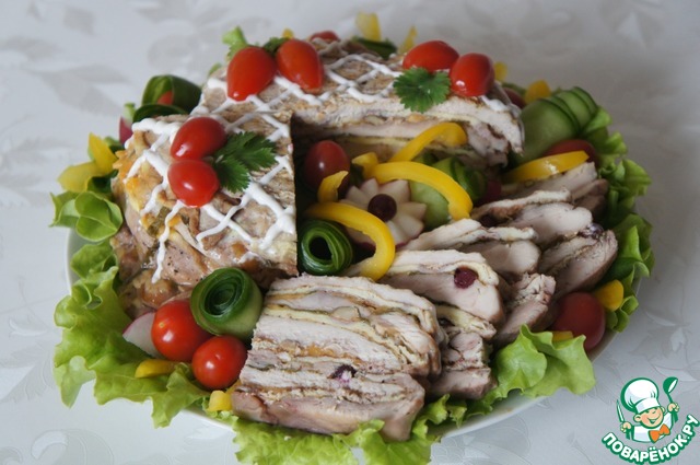 Полосатая закуска из разного куриного мяса с яичными блинчиками, орехами и сыром. Очень люблю эту закуску, уже несколько лет готовлю её в разных вариантах на праздники. Т. к. бывает некогда или просто лениво доставать все косточки из куриной тушки, мне придумался способ собирать руляду из отбитого мяса разных куриных частей, с различными добавками как пирамидку. Она всегда всем нравится и уходит на ура. Накопилось уже несколько вариантов. Делюсь рецептом с вами. Можно приготовить закуску накануне и подать на стол, как самостоятельное блюдо или приготовив какие-нибудь оригинальные бутерброды.