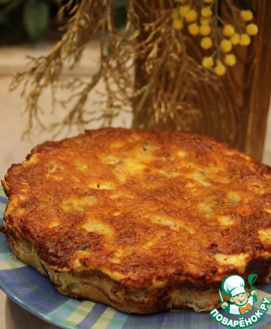 Приготовить заливку: яйца взболтать с молоком и высыпать к ним натертый сыр