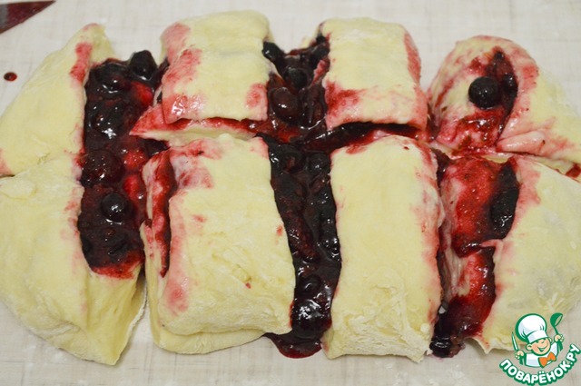 10. Каждый кусочек теста растягивать в жгут и завязать узелком. В процессе ягоды будут выпадать, а тесто смешается с начинкой. И получатся красивые булочки. Сверху разложить выпавшие ягоды и оставить для вторичного подхода на 20-30 минут.