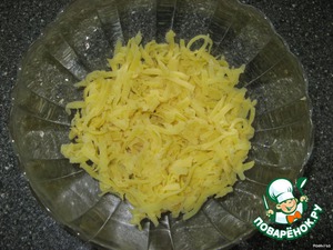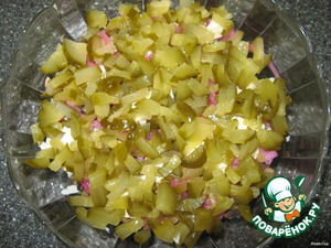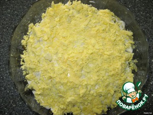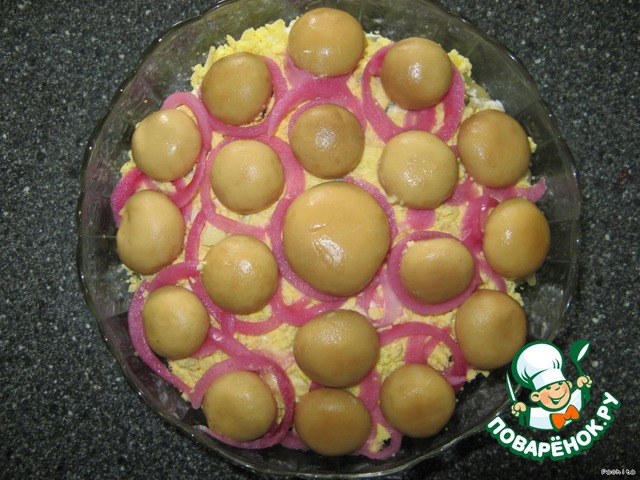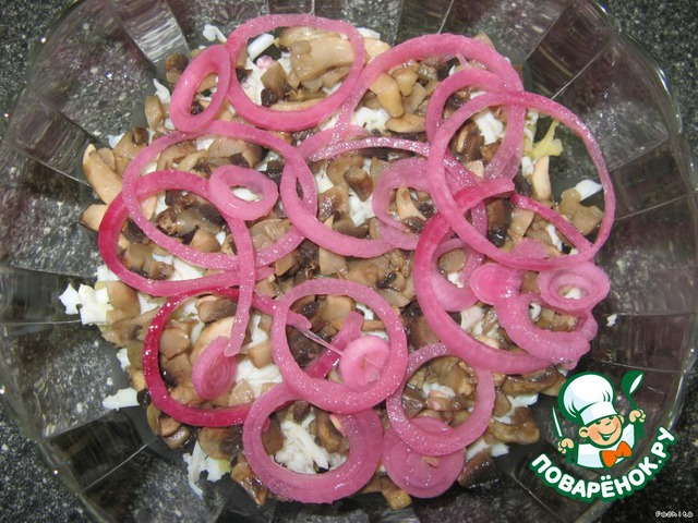 В салатник выкладываем слоями, каждый слой перекладываем кольцами лука и промазываем майонезом: