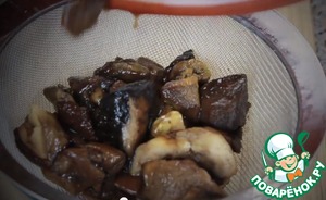 Сливаем жидкость от оттаявших грибов в отдельную емкость.