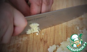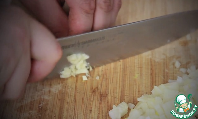 Ставим нагреваться наш бульон и нарезаем мелко лук и чеснок