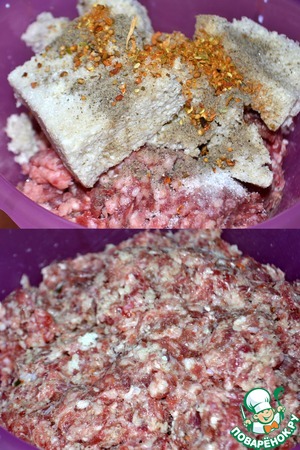В фарш добавим отжатый хлеб, половину молока, в котором размачивали хлеб, соль, перец и специи. Хорошо перемешаем.
