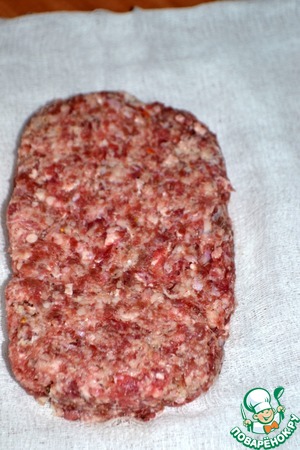Большой кусок марли свернем несколько раз и выложим половину полученного фарша. Сформируем батон (чтобы он вошел в сетку пароварки)