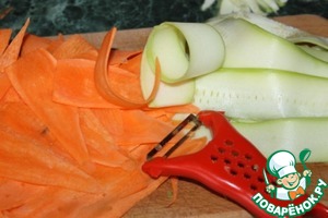 С помощью ножа для овощей режем морковь и кабачок очень тоненькими лепестками.
