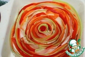 Форму смазываем растительным маслом с помощью кисти и формируем запеканку: начиная с середины, выкладываем овощные "лепестки" в виде розы по кругу, чередуя цвета.