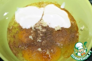 Готовим заливку: смешиваем яйца, соль, тёртый чеснок, приправы и йогурт (или сметану), взбиваем.