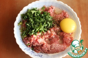Смешать фарш, яйцо, тертый имбирь, соль, перец, херес, соевый соус, мелко порубленную зелень.