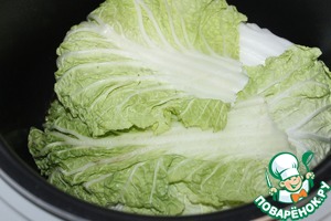 Китайскую капусту разобрать на листы и за 20 минут до окончания программы укрыть фрикадельки листами капусты, закрыть крышку и продолжить тушение.