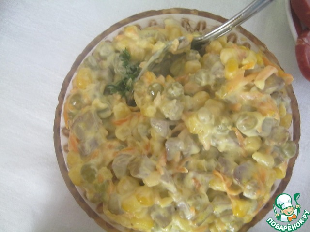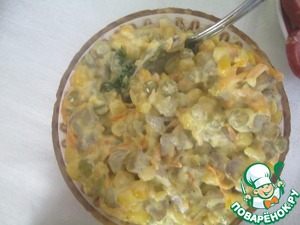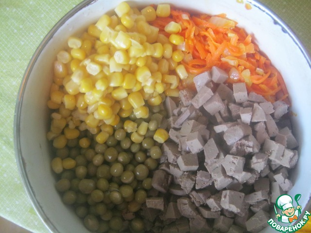 Выложить в миску порезанную кубиками печень, морковь с луком (без лишнего масла), кукурузу, горошек. -