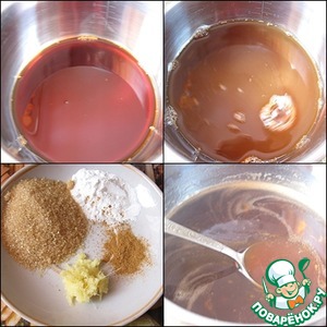Для этого в небольшую кастрюльку влить 1 стак. яблочного сока, добавить к нему 1/4 стак. соевого соуса, 3 ст. л. коричневого сахара, 1 ч. л. тертого имбиря, 1/4 ч. л. кайенского перца и 1,5 ч. л. крахмала. Довести соус до кипения и проварить в течение двух минут. -