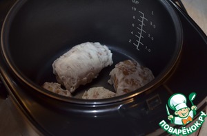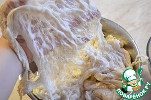 Жировую сетку необходимо помесить в миску с холодной водой, так она будет хорошо расправляться и не порвется.
