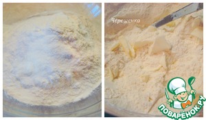 Муку просеять с разрыхлителем и солью. Холодное сливочное масло постругать в муку и смешать все вместе руками в крошку.