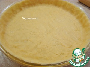 Охлажденное тесто раскатать в круг и выложить в форму для запекания. У меня форма диаметром 28 см, высота 4 см. Если у вас форма не стеклянная или керамическая, то лучше возьмите разъемную форму, т. к. пирог очень хрупкий. Да, если тесто не захочет раскатываться, то не беда. Раскатайте сколько сможете, а потом просто пальчиками распределите его по дну и стенкам формы.