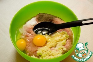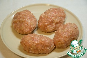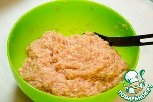 Приготовим фарш для котлет: смешать фарш, яйца, соль, перец, мякиш батона (размоченный в молоке).