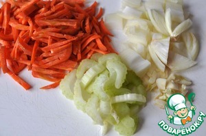 Все овощи: морковь, сельдерей, лук и чеснок мелко нарезаем или натираем с помощью тёрки.