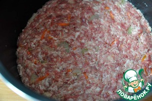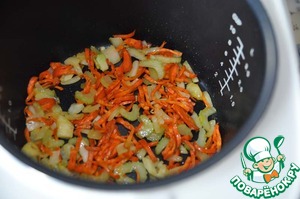 В чашу мультиварки наливаем растительное масло и кладём овощи, обжариваем их помешивая лопаткою (около 5 минут).