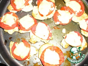 Через 10 минут достаём курицу. Переворачиваем. Сверху кладём помидорчики, на них давим чеснок и накрываем кусочком сыра. И ещё на 10 минут при таком же режиме.