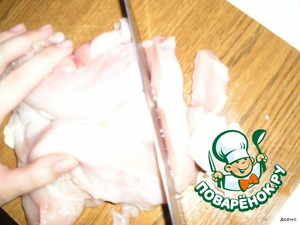 Разрезаем на кусочки поперёк волокон. Так мы добьёмся нежного вкуса.