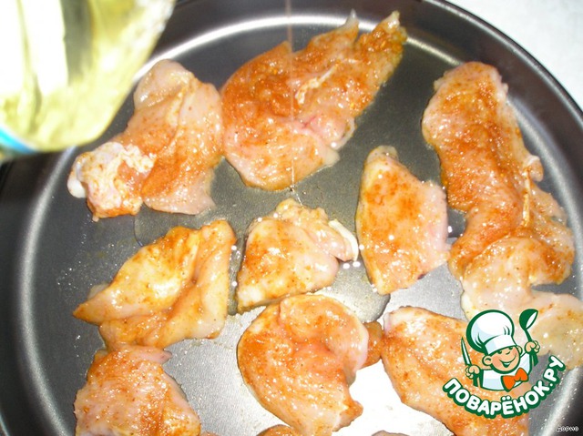 Переворачиваем. Присыпаем приправой вторую сторону. Так же нежно отбиваем. В форму её, красивую. Немного поливаем маслицем. И в духовку разогретую до 200 градусов.