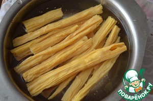 • Соевую спаржу достать из пакета и замочить в кипяченой воде на 3 часа (каждый час меняем воду).